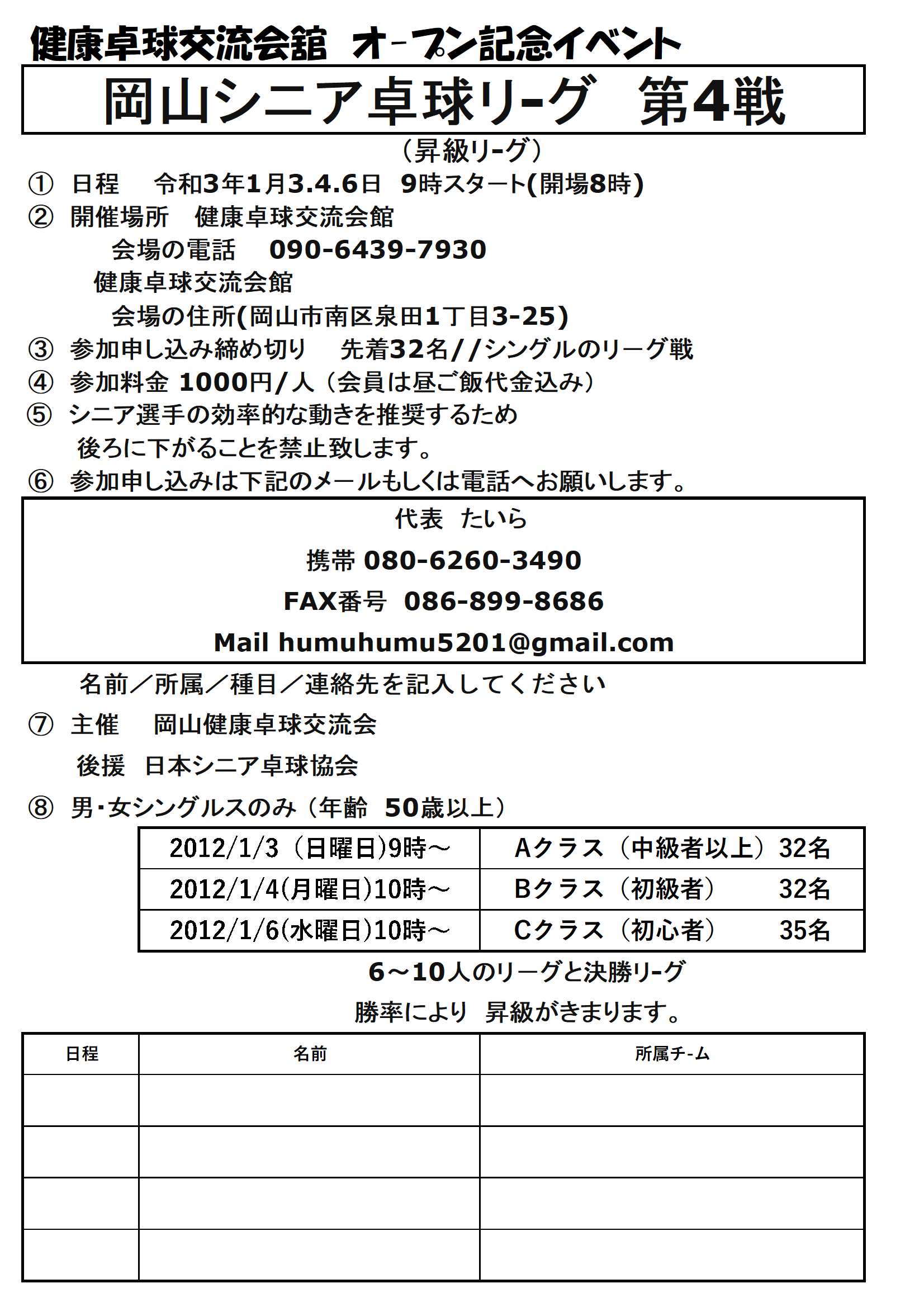 ← 12月岡山シニア卓球リ-グ 第3戦 HOME 12月は20日のプロツアーリ-グ第146戦 募集要項 →