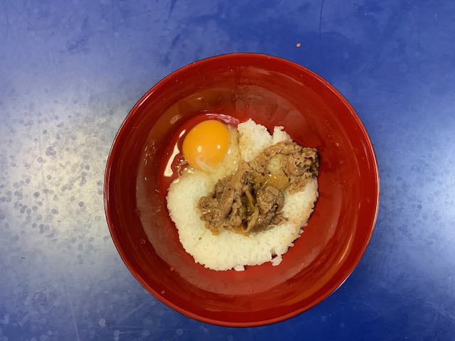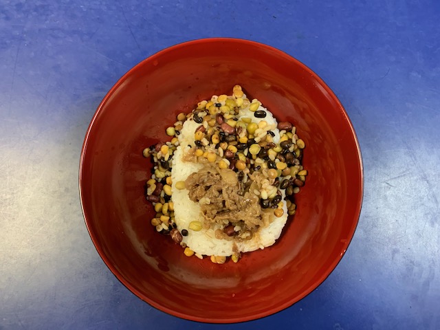 今日の料理は新作の 10種の豆入り牛丼です。