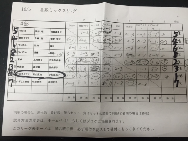10月5日 倉敷ミックス卓球リーグVer9.0