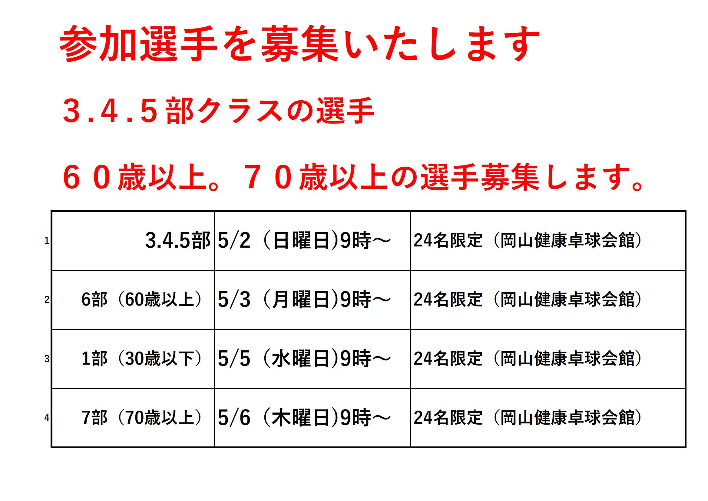 1 3.4.5部 5/2(日曜日)9時~ 【岡山健康卓球会館】