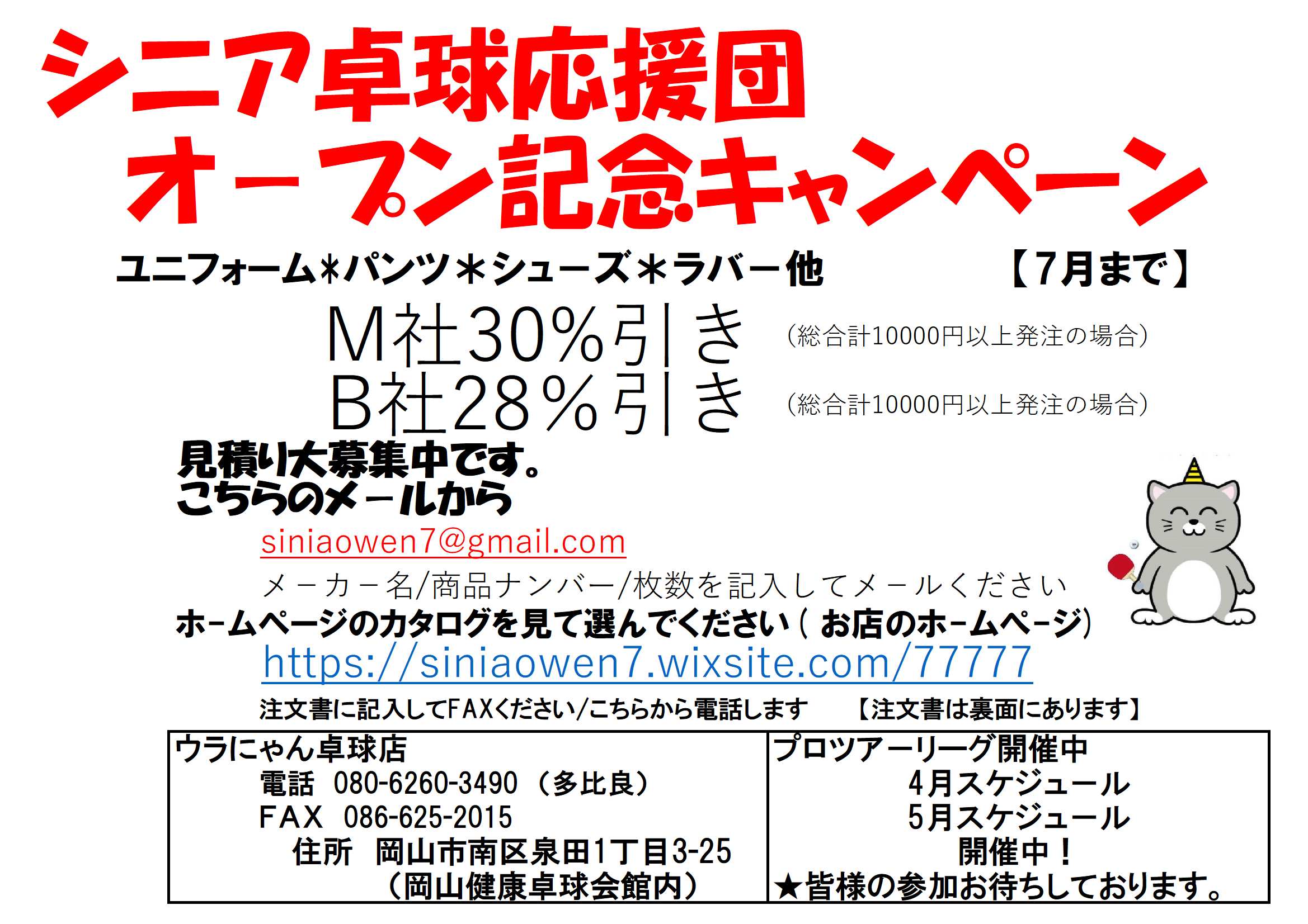 1.2部 4/18(日曜日)9時~ 24名限定(岡山健康卓球会館)